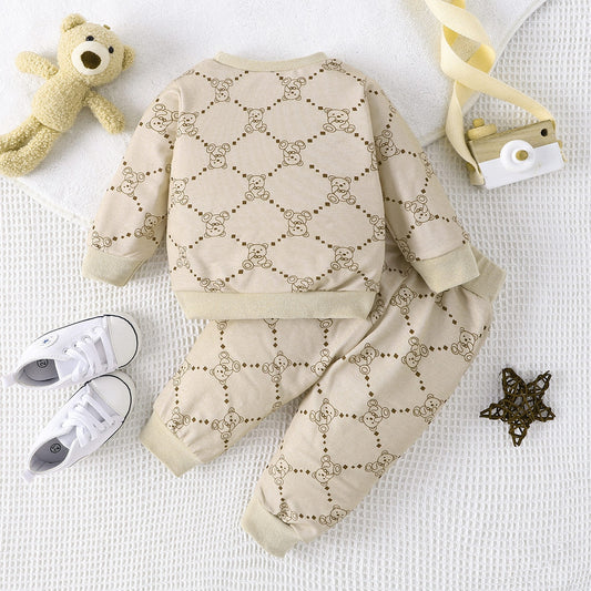 Bear Print Round Neck Top and Elastic Waist Pants Set